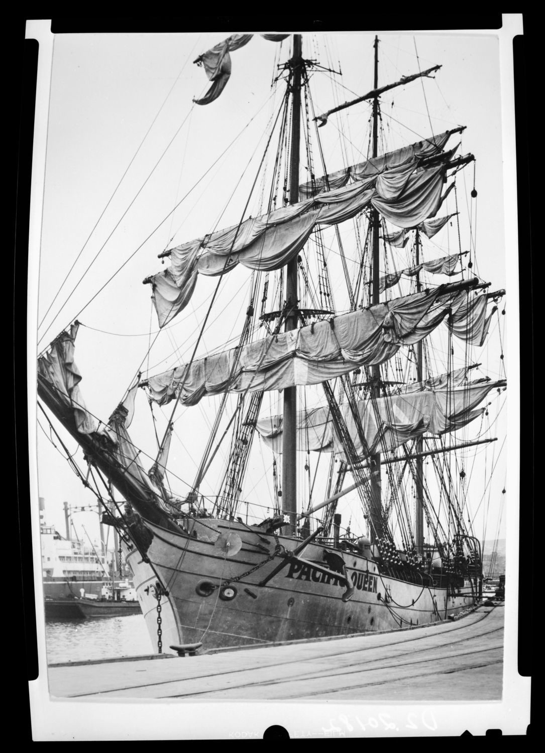 Pacific Queen (built 1886; ship, 3m), view off port bow, pierside at Fire House Dock at Terminal Island, undated