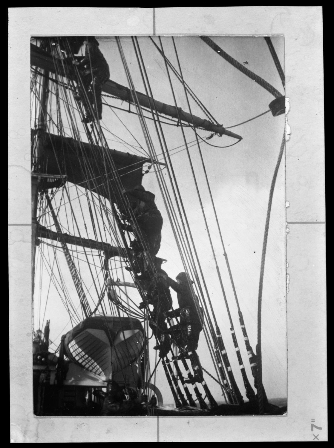 Joseph Conrad (ship, 3m) view on board of crew members climbing the shrouds, going aloft, possibly 1937