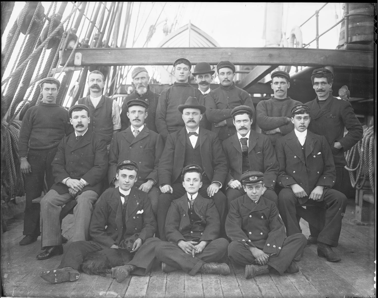 Looking aft, crew posing on main deck, shipmaster in center; dog in lower left; parrot in upper right.[CR]Vessel identified by Andy Nesdall.