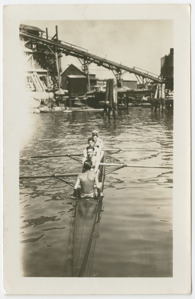 South End Rowing Club coxed four man sweep near docks, circa July 1929