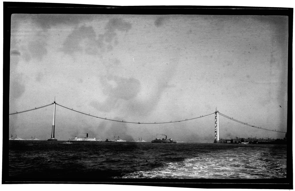 View of partially constructed bridge from water. BERKELEY (built 1898; ferry) on left, and OAKLAND (built 1875; paddle ferry) on right. U.S. Naval vessels in background.