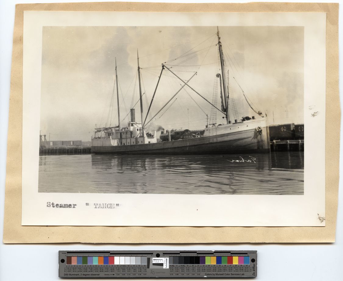 Tahoe (steam schooner) wharfside, possibly at San Pedro, CA, undated