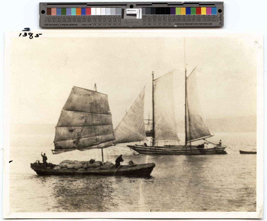 Junk and an unidentified scow schooner on San Francisco Bay, CA, undated