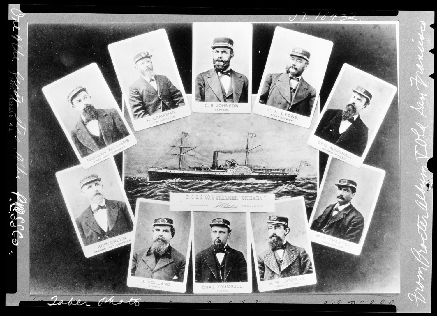 A Taber photo from Procter Album V, Old San Francisco. Medley consisting of an artist's conception of the vessel under way and portrait photos of ten crewmen identified as:[CR]C.B. Johnson, Captain; C.E. Lyons, First Officer; Geo. Marshall, Second Officer; W.S. Thaxter, Third Officer; H.M. Landers, Freight Clerk; Chas. Trumbull, Purser; J. Holland, Steward; John Green, Second Ass't Engineer; Morgan Williams, First Ass't Engineer; and H. Lampman, Chief Engineer. P.C.S.S. Co.'s Steamer "Orizaba"