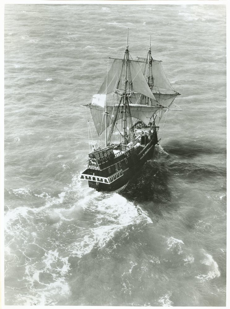 Two images of Golden Hinde (built 1973; galleon, replica), designed by L. Christian Norgaard, at an unknown location. Vessel is underway with full sails. The vessel first sailed to San Francisco in 1973 to commemorate Sir Francis Drake's claiming of California for Queen Elizabeth I. Norgaard was a marine engineer and naval architect that worked primarily in the San Francisco Bay Area.