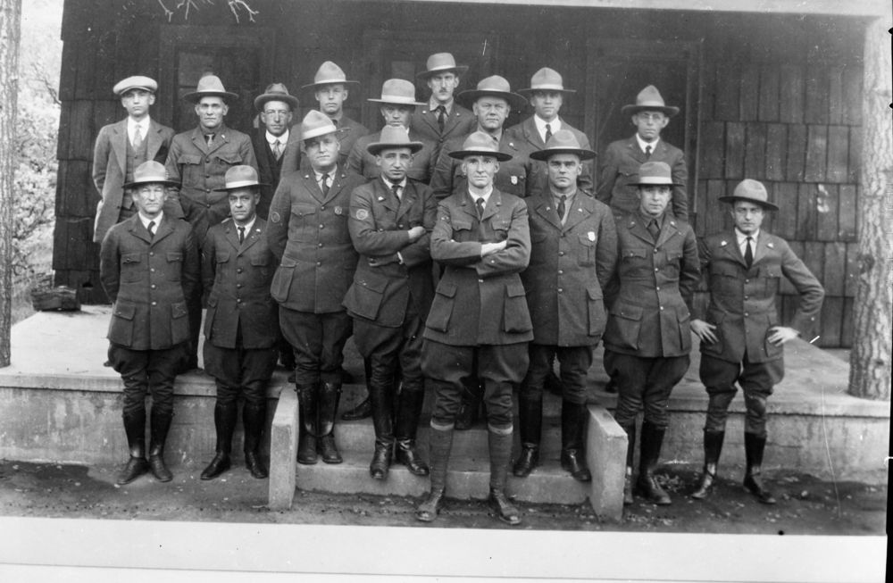 NPS Groups, Chief Ranger Conference. Back Row: Holmes, Reusch, Marrott, Hadley, Collins, Wells, Townsley, Hall and Decker. Front Row: Clapp, Burnett, Scoyen, White, Hopping, Allen and Carter.