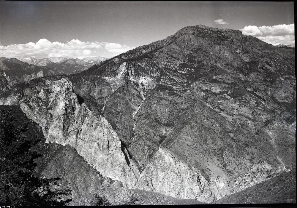 Unknown Photographer, Unknown Date, Cliffs above Horeshoe Bend, Sequoia National Forest, Misc. Geology, Misc. Peaks. Wren Peak and marble outcrops north of Horeshoe Bend.