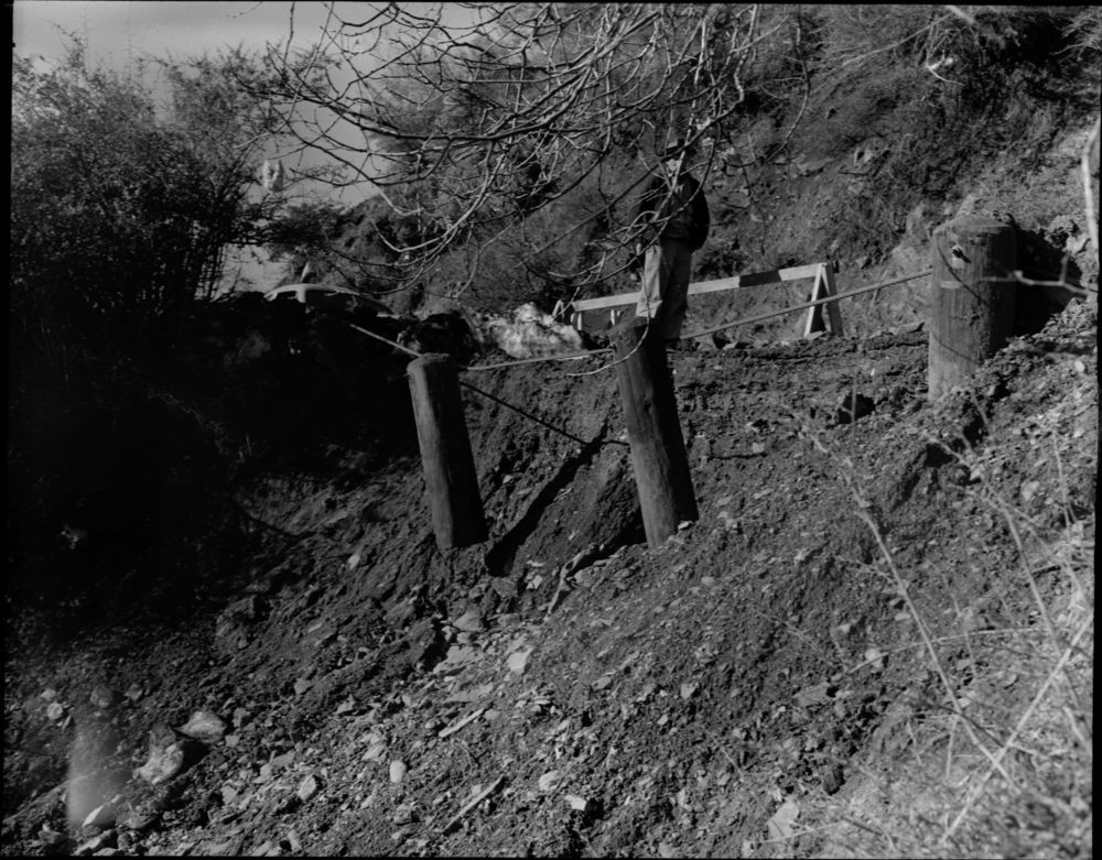 Unknown Photographer, Generals Highway near Deer Ridge, SNP, Floods and Storm Damage, Storm damage to highway. NPS Individuals, Bob Leake pictured. 520100.