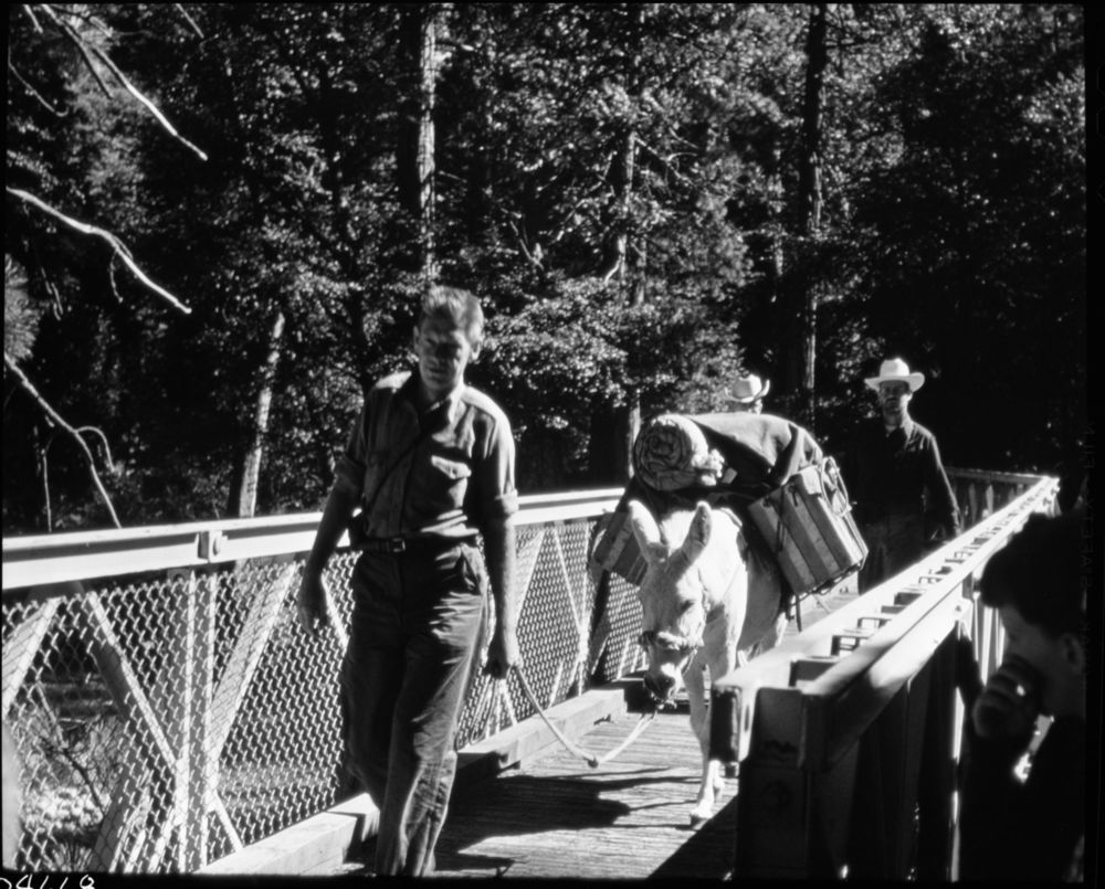Unknown Photographer, Unknown DAte, South Fork Kings River, KCNP, Stock Use, Bridges, Burro Party crossing South Fork on bridge at Junction of Kings and Bubbs Creek trails.