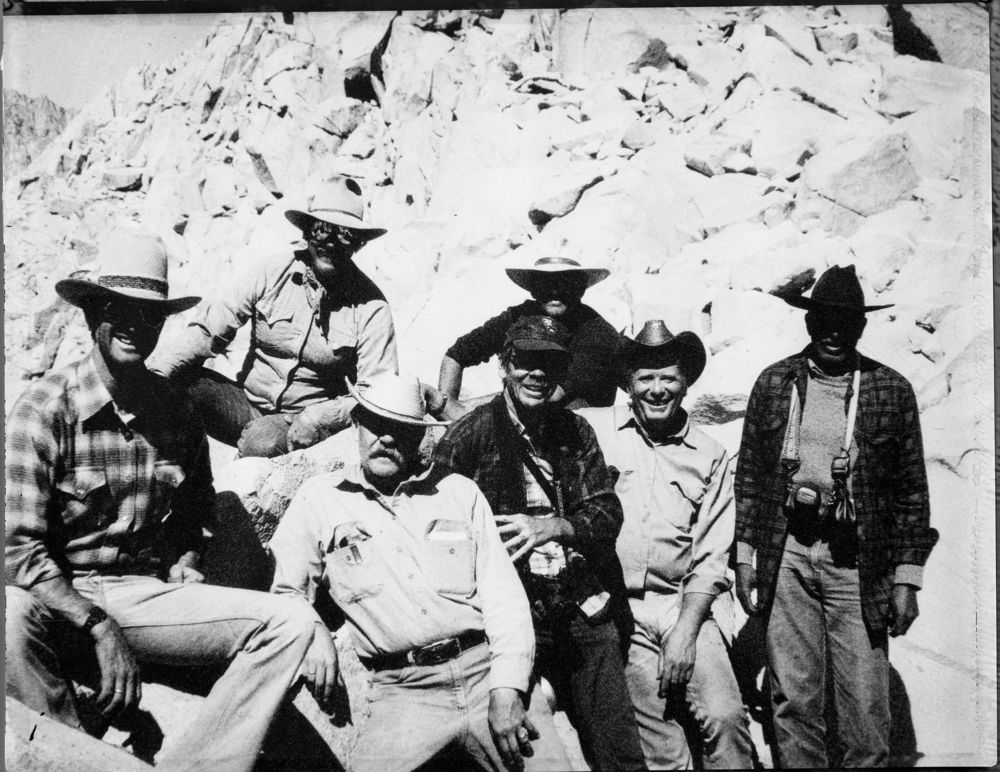 John Palmer, 840901, Mathers Pass, KCNP, NPS Groups. Left to Right: Marv Jensen, Management Assistant: Jim Harvy, Packer: John Palmer, Chief Park Interpreter: Larry Bancroft, Chief Resource Management: Pete Allen, Ranger: Ken Bachmeyer, Chief Park Maintenance: Jim Lancy, Assistant Park Superintendent. Squad Backcountry Trip.