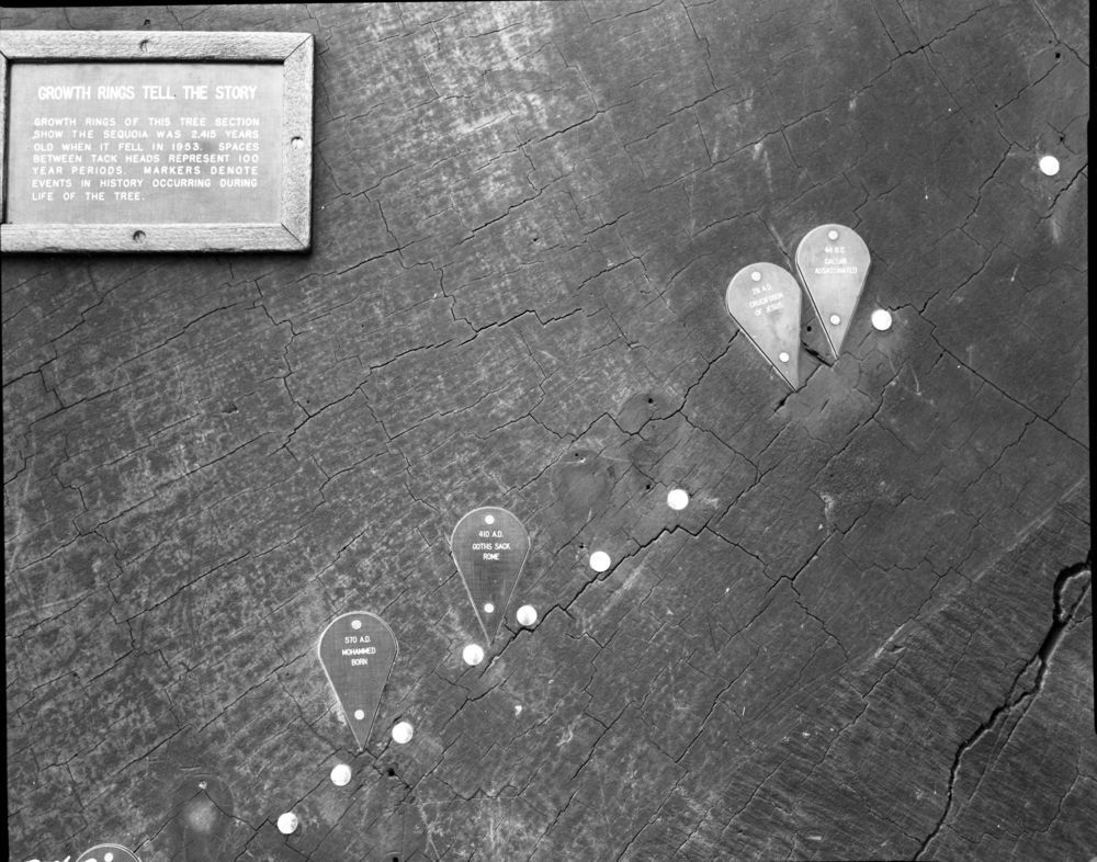 Exhibits, Giant Sequoia Sections, Section with dates on rings, Round Meadow.