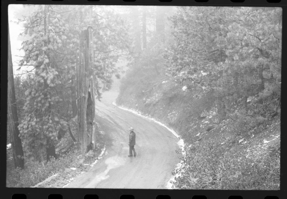 Bill Tweed, Mineral King Road, SNP, Aborglyphs. Witness Tree. J. Hartzell in photo. Near Camp Conifer. 770516. Compare with Negative No. 01888.