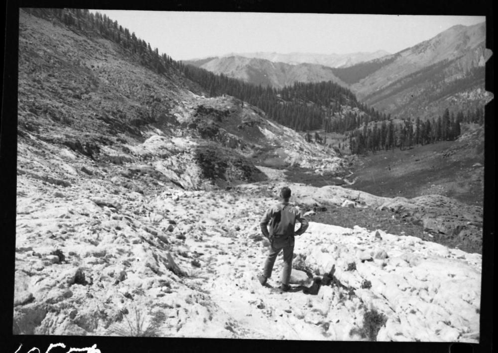 Misc. Geology, Mineral King Valley. Bob Trask on marble outcrop in White Chief area. View north to Timber Gap.