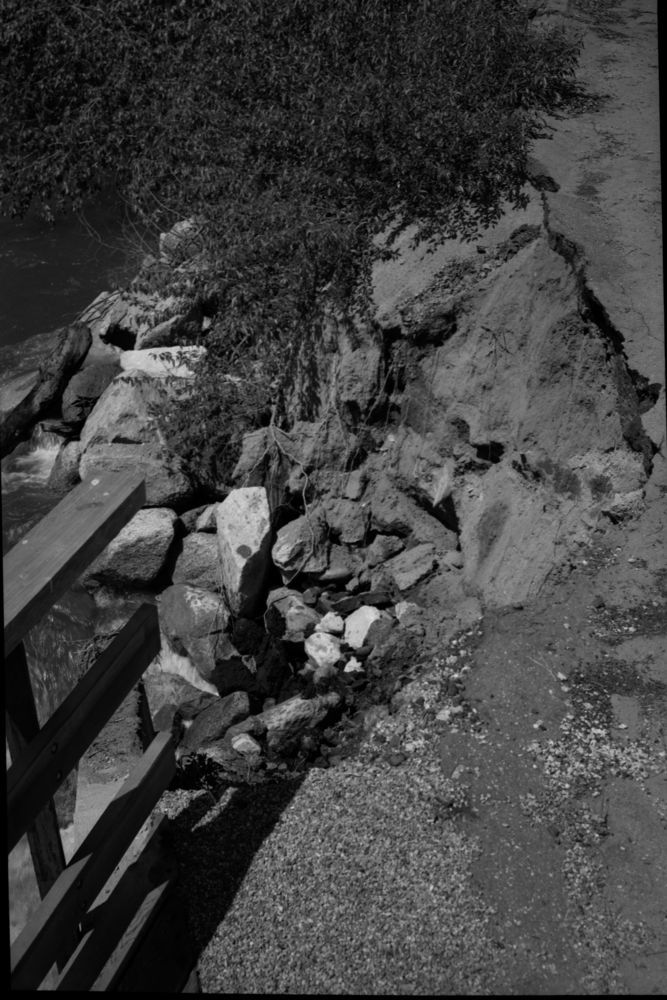 Robert Zink, South Fork Kings River, Cedar Grove, KCNP, Floods and Storm Damage, Highwater washing bridge abutment on Kings River Bridge. 690604.