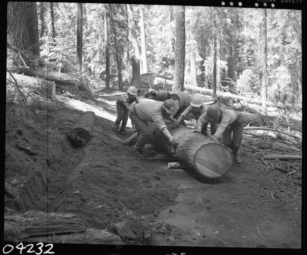 Hank Jones, 780728, Giant Forest, SNP, Construction, YCC Crew working on Congress Trail setting logs for benches.