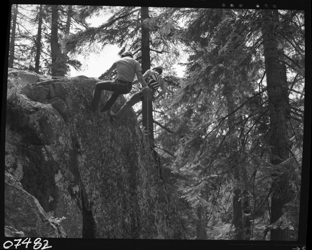 John Palmer, 770718, Lodgepole, SNP, Interpretive Activities, climbing demonstration, with John Krambrink and Milo Jenkins. NPS Individuals.