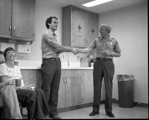 Hank Jones, 780807, Ash Mountain, SNP, NPS Individuals, Air Operations Officer Ed Nelson receiving 10 year pin from Supt. David Thompson. Park Superintendents.