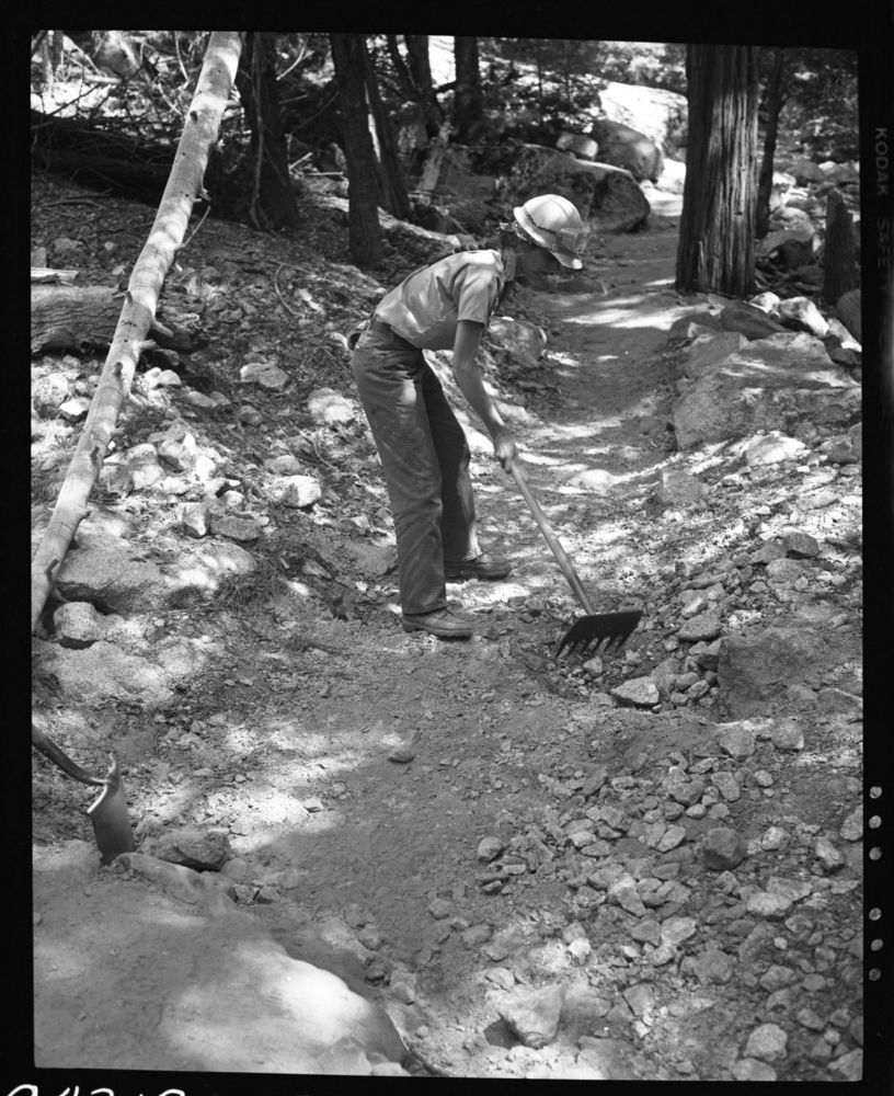 Construction, California Conservation Corps members working on Mist Falls Trail. Individual unidentified.