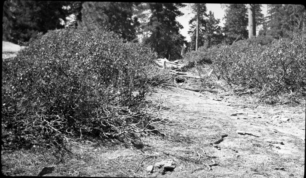 Unknown Photographer, 400000, Giant Forest, SNP, Research Plots, Deer, contrasting abundant growth inside experimental plot with that badly overbrowsed Prunus and Ceanothus on the outside.