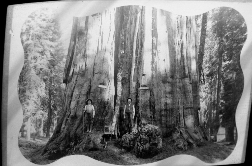 Misc. Named Giant Sequoias, Historic Individuals, L to R: John Jordan, James Jordan at Ed by Ned Tree near Round Meadow. Note: on 11 August 1933 Mrs. Amy W. Childs of Hanford gave date of photograph