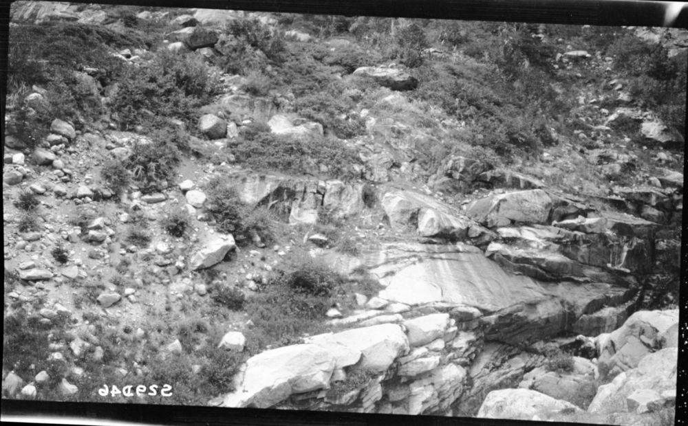 High Sierra Trail Investigation, Misc. Canyons, route along east side of Buck Canyon from proposed bridge site. Neg. copied reversed.