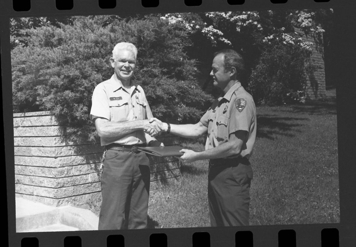 NPS Individuals, Park Superintendents, Dedications and Ceremonies. Maintenance Mechanic Foreman, Ash Mountain District, Bill Stroh receives NPS Superior Service Award from Superintendent Boyd Evison.
