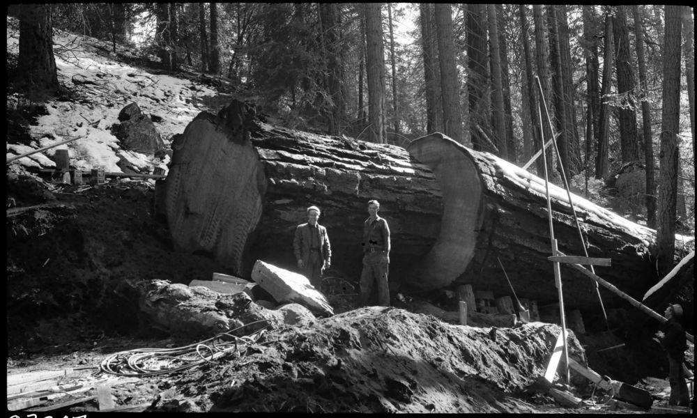 Giant Sequoia Sections, cutting tree to get at section. Individuals unidentified.