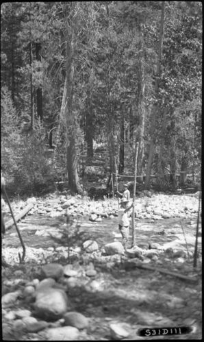 John Diehl, 310000, Kern River, SNP, Construction, Chagoopa Trail Bridge site looking east, individuals unidentified