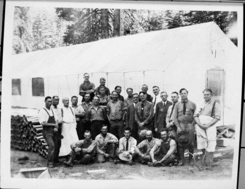Unknown Photographer, Unknown Date, Grant Grove, KCNP, Construction, NPS Groups, Park officers and laborers at cook shack. The four rangers in the middle row, right, are: Charlie Lee, Milo Decker, Steve Curtis, Ford Spigelmyre, Col. White in back row.