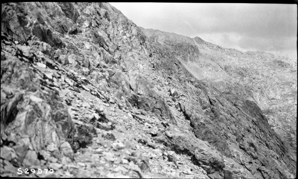 High Sierra Trail Investigation, Misc. Gaps and Passes, upon leaving pass, on the Kern-Kaweah side, rock formation pictured is encountered.