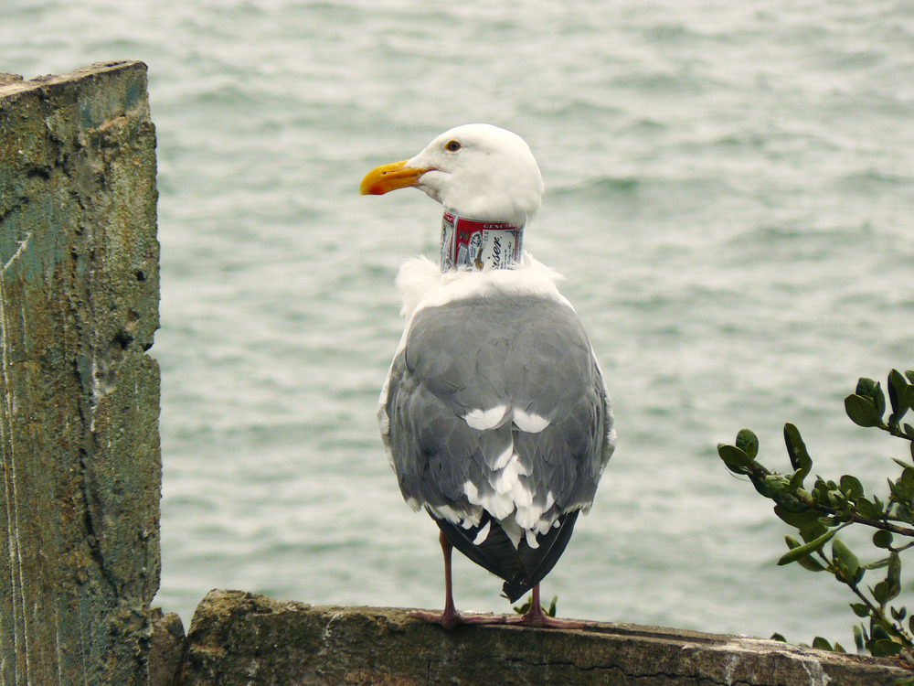 Western Gull (Larus occidentalis) on Alcatraz Island with a beercan around its neck.