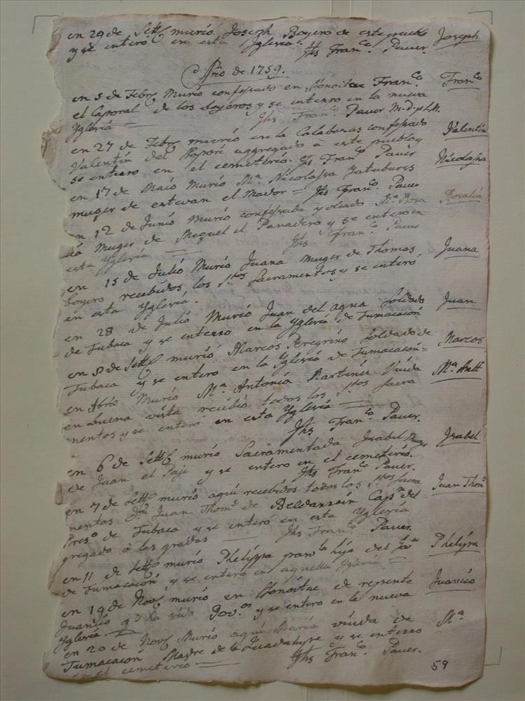 Guevavi Mission Record, page 59 || Isabel. On the 6th of September, Isabel, wife of Juan, the page, died in receipt of the sacraments and was buried in the cemetery. = IHS Francisco Pauer