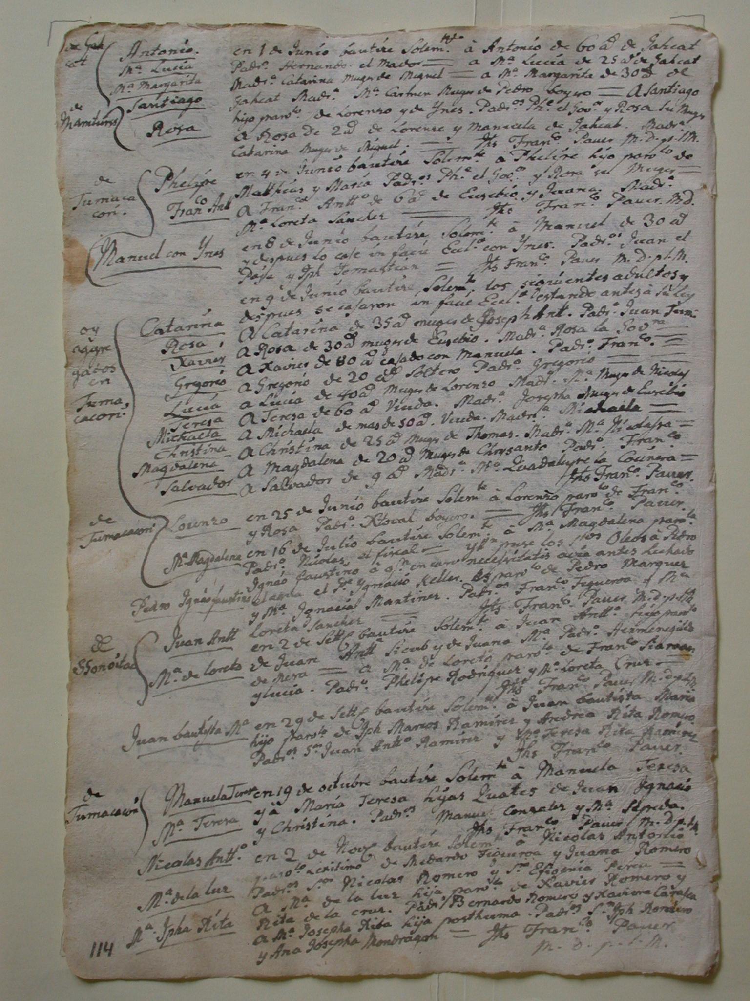 Guevavi Mission Record, page 114 || On the 9th of June (1758) I baptized the following adults. Afterwards they were married in church ceremony, having been previously married by their law, today gathered to Tumacácori.
