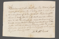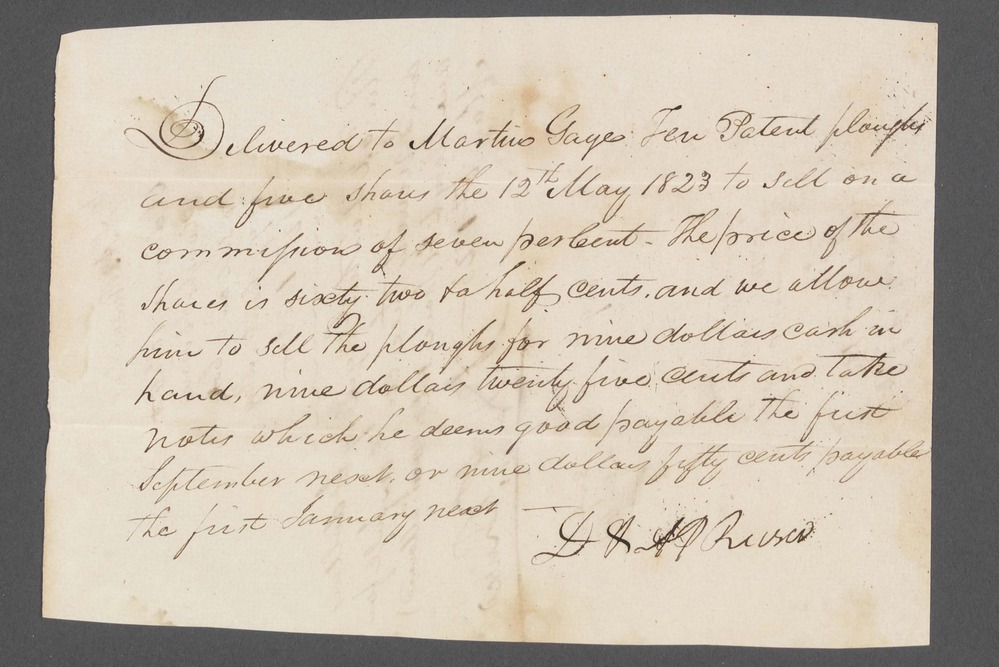 On front of document: “Delivered to Martin Gage Ten Patent ploughs and five shares the 12th May 1823 to sell on a commission of seven per Cent. The price of the Shares is sixty two and a half cents and we allow him to sell the ploughs for nine dollars cash in hand, nine dollars twenty five cents and take notes which he deems good payable the first September next or nine dollars fifty cents payable the first of January next - D & AP Rusco” On back of document: "D. & A.P. Rusco's delivery of 10 Patent Ploughs & 5 Shares to sell on a Com. of 7 pr Cent. May 12th 1823 - Rec'd of Martin Gage Eight dollars and ninety three cents in full for one plough & 1 Share sold. (com'n allowed) May 30th 1823 - D. & A.P. Rusco 8.93 D. & A.P. Rusco: Receipt for $8.93 To be allowed in the [illegible] settlement of Ploughs - "