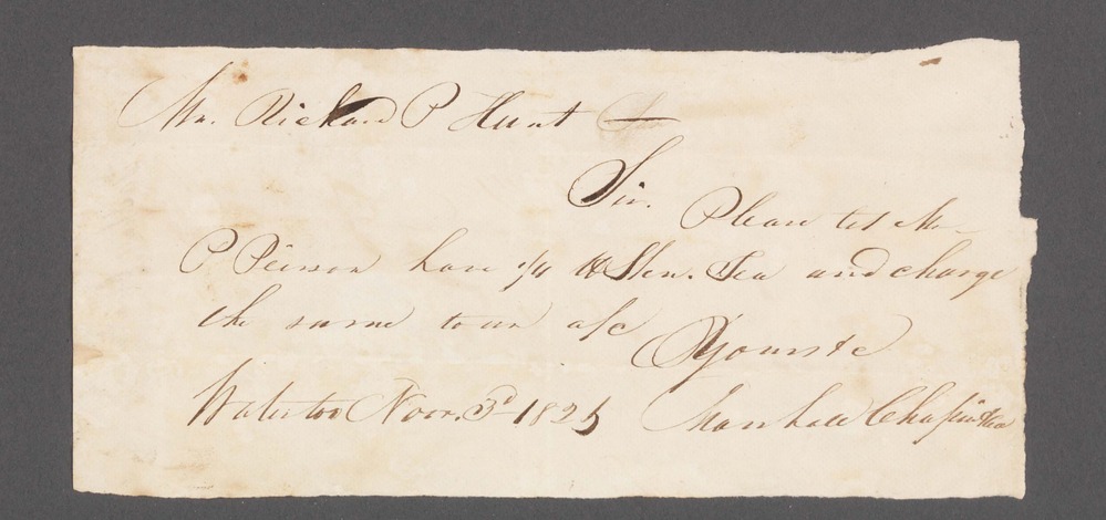 On front of document: "Mr. Richard P Hunt - Sir. Please let Mr. P [Peirson?] have 1/4 lb Slen. Tea and charge the same to our a/c Yours & c Marshall Chapin & Co. Waterloo Nov 3d 1826" On back of document: "Marshall Chapin"