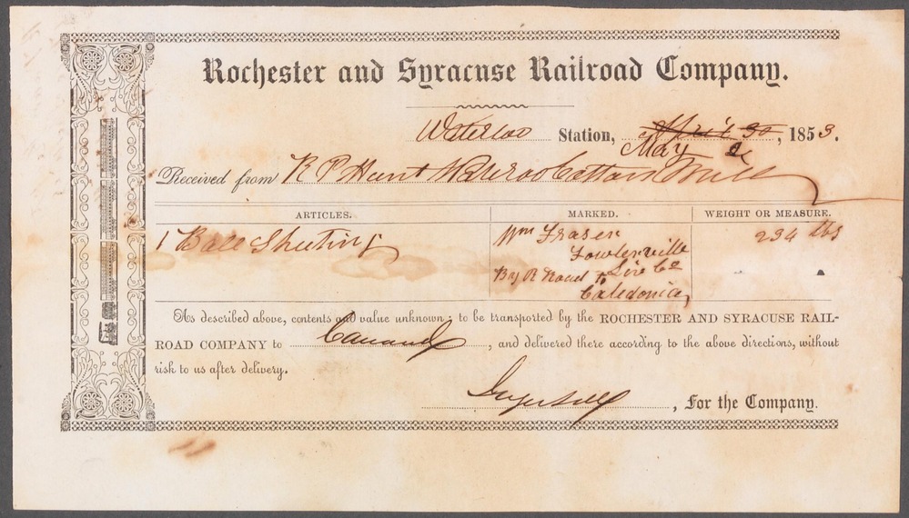 On front of document: [Part of document is printed and part is handwritten] "Rochester and Syracuse Railroad Company Waterloo Station May 2, 1853 Received from R P Hunt Waterloo Cotton Mill Articles. 1 Bale Sheeting Marked. Wm Fraser Fowlerville [Liv?] Co By R Road to Caledonia Weight or Measure. 234 lbs As described above, contents and value unknown; to be transported by the Rochester and Syracuse Rail-Road Company to Canand, and delivered there according to the above directions, without risk to us after delivery [Ingersoll?], for the Company.” On back of document: "[Handwritten] R Road Recpt 1 Bale Sheeting Wm Fraser Fowlerville May 2 /53 [printed] Conditions and Rules 1. The business of the Freight Department of each Corporation, is to carry property which is properly the subject of transportation in Cars. 2. The Corporation will not, however, receive or carry any Bank Bills, Drafts, Notes, Deeds, Contract, or other writings, or be reponsible for their loss. 3. No Conductor, or other Agent of the Corporation, is Authorized to take charge of Bank Notes, Money, or other valuable papers. 4. No Gold or Silver Coin, or Bullion, or Manufactured Articles of Gold or Silver, Jewels, Watches, Pictures, Plated Articles, Glass, Silks or Lace, will be carried by the Corporation, for the loss of which it will be responsible, unless such articles when delivered, is also delivered a memorandum in writing, stating the character and kind of articles, and their value, and unless a proper extra price for the carriage and responsibilty for such articles be paid. 5. Gunpowder, Friction Matches, and the like combustible articles, will not be taken on any terms; and if found secreted, or among ther goods, they will be forfeited or destroyed; and in case of damage, the shipper or consignor will be held liable therefor. 6. Articles will not be received for transportation, unless properly packed in suitable casks, boxes, bales or packages; and each must be well and clearly marked with the name of the consignee and the station where they are to be delivered; otherwise they will not be receipted for, in which case no damages for loss or miscarriage will be paid. All property is subject to cooperage, when necessary. Goods in bundles will not be considered as properly packed, and the Company will not be responsible for any loss of parts or the whole of such packages. No allowance for deficiency of Lemons or Oranges, or the like, if not coverd with canvas, will be made. 7. The Corporation will not be liable for property, unless receipted by a duly authorized Agent; and the destination of property cannot be changed after shipment. 8. The Corporation will not be responsible for damage, occasioned by delays, from storms, accidents, or unavoidable causes; or by the decay or injury of perishable articles; or from injury to properly produced frost, heat of the elements. Perishable property must always be prepaid. 9. The Corporation will only be liable as warehousemen for property while in the storehouse. 10. Storage, at customary rates, will be charged for all property not taken from the warehouse within one day after arrival. "