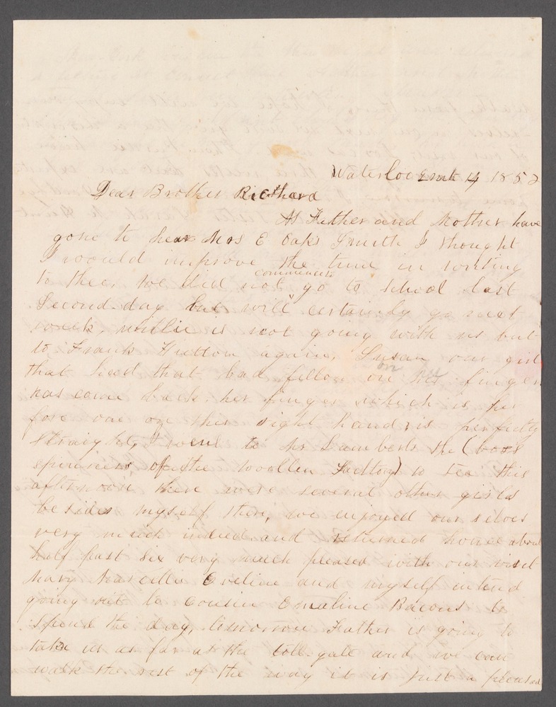 “Waterloo 9 mo 14th 1852 Dear Brother Richard As Father and Mother have gone to hear Mrs E Oaks Smith, I thought I would improve the time in writing to thee, we did not commence to go to school last Second-day but will certainly go next week. Willie is not going with us but to Frank Hutton again. Susan our girl that had that bad fellon on her finger on his [some one added in pencil above – on her] finger has come back, her finger which is her fore one on her right hand is perfectly Straight, I went to Mr Lamberts the (boss spinners of the Woollen Factory) to tea this afternoon there were several other girls besides myself there, we enjoyed ourselves very much indeed and returned home about half past six very much pleased with our visit Mary Marcella Eveline and myself intend going out to Cousin Emaline Bacons to spend the day tomorrow Father is going to take us as far as the toll-gate and we can walk the rest of the way it is but a pleasant walk from there. I hope we will enjoy ourselves in our next we will give thee a discription of our visit, Dorcas and [Thom] Purdie have been traveling this three weeks but are expected home tomorrow, I must now close so Good bye from thy Affectionate Sister Sarah M Hunt” "Dear Brother I am sorry that this week has passed and I have not recieced or dispatched a letter but we have been very busy all this week we have got our old Cook Susan back and her finger is a great deal better but she can-not bend it much yet or I dont believe she ever will Aunt Margaret Pryor & Uncle George are here they came on Seconday and stayed until Third Day Afternoon they are looking for a house here they can-not bear the idea of staying out there all Winter. if thee wishes to write to James Best direct thy letters to John Best Lockport Michigan, I believe but I guess thee will not want to write before thee recieves another letter from us and then I will try to find out whether it is Michigan or Ohio Mary Abbey says that I must give her love to thee and say that thee must write to her. Mrs. Rose from New-York was here the other night and delivered a lecture at Concert Hall Father and Mother thought her very interesting speaker – John Laing shot Aunt Eliza's dog the other day they thought he was going mad. We had a call the other day from Emmaline Bacon Emma Bacon Benjamin & Thaddeus. The Syracuse Convention had ended and I suppose they had a great time. We are Cutting the corn in the field next to the house I am very glad that we can see the wall once more It is getting pretty late and I must close so farewell thy affectionate sister Mary"