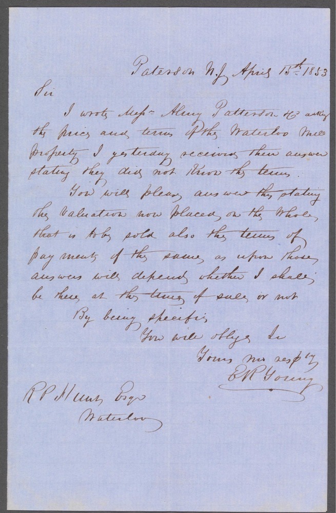 Page 1: “Paterson N. J. April 15th 1853 Sir I wrote Mssrs Almy Patterson & Co asking the price and terms of the Waterloo Mill property. I yesterday received their answer stating they did not know the terms. You will please answer this stating the valuation now placed on the whole that is to be sold also the terms of payments of the same as upon those answers will depend whether I shall be there as the time of sale or not. By being specific You will oblige In Yours resp’y E R Young R P Hunt Esq Waterloo” Page 2: “The mill & fixtures Cost about $54,000 It is to be sold [illegible] to the Highest bidder without reserve payments 1/4 down bals in 6-12-18 & 24 months with interest [illegible] on the property &[illegible] 4mo 18th 53" Page 3: “Please take notice that a meeting of the Stockholders of the Waterloo Cotton Company will be held at their offices on the 30 inst at 1 pm to go see [illegible] [inspections?] the subject of the sale of the mill & closing up of the concern & other business a punctual attendance is [deserved?] R P Hunt President Waterloo 4mo 19th 53” "E. R. Young 4mo 15th/53"