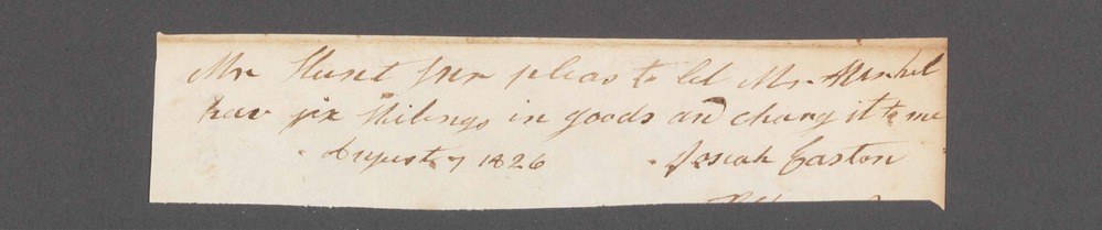 On front of document: "Mr Hunt Sir pleas to let Mr [Markel?] have six Shillings in goods and charg it to me Josiah Easton August 7 1826" On back of document: "J. Easton"