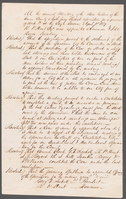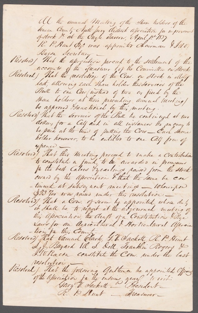 On front of document: "At the annual Meeting of the Share holders of the Seneca County North Jury District Association for improvement of Stock &c at the Eagle Tavern April 1st 1837. R.P. Hunt Esqr. was appointed chairman & J. W. Bacon Secretary –Resolved That the Association proceed to the settlement of the accounts of the Treasurer of the Committee on Stock –Resolved that the resolution of the Com. on stock in May last allowing each share holder the services of the Bull to one Cow (instead of two as fixed by the share holders at their preceeding annual meeting) be approved & sanctioned by this meeting –Resolved That the services of the Bull be continued at two dollars for a Calf and in all instances the money be paid at the time of putting the Cow. Each share holder however, to be entitled to one calf free of expense –Resolved That this meeting proceed to make a contribution, to contitute a fund to be awarded in premiums for the best calves & yearlings raised from the Stock owned by the association & that the same be continued at subsequent meetings – Where upon $23 was raised under this resolution. Resolved That a Com. of seven be appointed whose duty it shall be to report at the adjourned meeting of this association the draft of a constitution & Bye laws for an Agricultural and Horticultural Association for this county –Resolved That Saml Clark, G. V. Sackett, R.P. Hunt, S.J. Bayard, W J Dell, Franklin Rogers & J.W. Bacon constitute the Com. under the last resolution –Resolved That the following Gentlemen be appointed Officers of the Aƒsociation for the ensuing year To Wit: [begin list] G V Sackett - President R P Hunt –Treasurer " " On back of document: " J.W. Bacon – Secretary Isreal Lisk James Stewart Franklin Rogers Ephraim Chapin & G.V. Sacket } Com. on Stock [end list] Resolved That this meeting be adjourned to Saturday the 24th June next at one Oclk P.M. at this place – That notice of the same be published in each of the newspapers printed in this Co & that all persons interested in the prosperity of the Agricultural & Horticultural interests of the County & of the breeding of improved Stock be invited to attend & to exhibit on that day any stock they may see fit. [on side of page] Report of Stock Association 4mo 1st 1837"