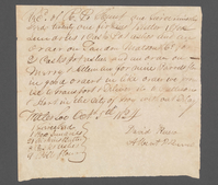 On front of document: “Rec’d of R.P. Hunt one [Tierce?] timothy Seed twenty one firkins Butter 1 Box Sundries 1 Cask Pot ashes and an order on Landon Matson & Co. for 2 Casks pot ashes. and an order on Merry & Allen an for nine Barrels flour in good order & in like order we promise to Transport & Deliver it to Pattison & Hart in the City of Troy without Delay Waterloo Octr 5th 1824 David Rusco Albert P Rusco 1 [illegible] Seed 1 Box Sundries 21 Firkins Butter 3 Casks Ashes 9 Bbls flour" On back of document: "David Rusco & Albert P. Rusco's Recpt 10mo 5th 1824"