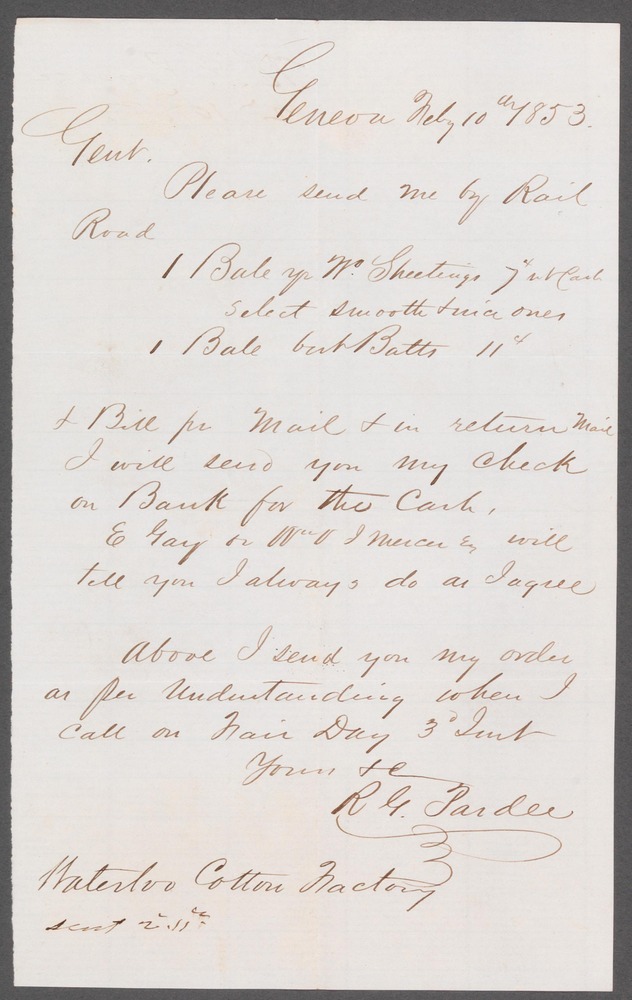 On front of document: "Geneva Feby 10th 1853. Gent. Please send me by Rail Road 1 Bale yr No. Sheetings 7c Cash Select smooth & nice ones 1 Bale Cot Batts 11ct & Bill pr Mail & in return Mail I will send you my check on Bank for the Cash E Gay or Wm [J?] Mercer Eq will tell you I always do as I agree Above I send you my order as per understanding when I call on Fair Day 3d Inst Yours & c R G Pardee Waterloo Cotton Factory” Note “sent 2d 11th” On back of document: "R.G. Pardee 2mo 10th 53"