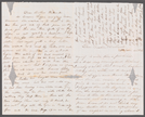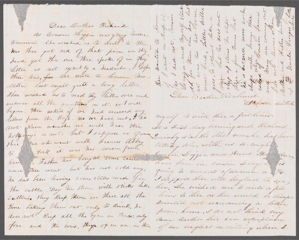 “Waterloo 12 mo 11th [1853] Dear Brother Richard I have seated myself to write thee a few lines. It is First day evening and Richard Quinby is in the other room. he had been taking tea with us to night. Cousin Lizzie and Aunt Mary Ann have been in cousin L says [she is] going to morrow afternoon a [loss] ¼ I suppose thee will be glad to see her. She wished me to write a few lines to thee as thee would be disappointed not recieving a letter from home. I do not think my dear Brother thee can complain of our neglect in writing when I [ ] thee that this will be [fourth?] letter sent thee since last Second day. Now dont thee think we are prompt in writing I am [envy?] we loose Cousin [Libbie] so soon but I suppose you miss her much more than we do. Willie says whoever is writing to Richard must tell him that he is sick again had the Croup last night but is much better to day sends his love and a kiss to thee he kissed the paper and said [ ] I might give “his kiss to thee”. I think we will go to Mackey’s on Seventh day if we go at all, I have not seen Caroline for some time. We think we shall go to Cousin Emeline Bacons and spend a day while thee is home. Thy pigs are growing very nicely indeed they are still in the pen Pa bought two pigs of John Alliger about the size of thine but I guess a little smaller than thine. Sister Sarah & I filled a sheet to Marcella Underhill last night it is the first time we have written to her since she left home. Uncle George Pryor is again sick with the chills how sorry I feel for him he is so old. I almost forgot to acknowledge the reciept of thy very nice long and interesting letter. We had nothing to say in our letters at least not as much as thee has, but thee will hear all the news when Cousin Lizzie returns. I must leave some space for Sarah to write with [ ] much love from Father Mother [sister?] & brothers I remain thy affectionate sister Mary Hunt excuse bad writing" “Dear Brother Richard As Cousin Lizzie was going home tomorrow she wished us to write to thee has thee got rid of that pain in thy head yet the one thee spoke of in thy Letter as not exactly a headache. I hope thee has we wrote to Cousin Marcella last night quite a long letter Thee wished us to read thy letter over and answer all the questions in it, so I will begin. Thee asked if we had recieved any letters from Boys no we have not. I do not know weather we will have thee [ holidays] or not, but I suppose so of course thee asked who went with Frances Abbey to New York it was her cousin from [Pennsylvania] Father has bought some cattle since thee went but has not sold any, he has been having some stalls made for the cattle. they tie them with stick like [sattons?]. they keep them in there all the time taking them out only to drink, he does not keep all the oxen in there only four and the cows, thine oxen are in there thee wanted to know if I went to [ st] no I did not. Cousin Lizzie and myself started for there one day but it was too hot. Some went back. Little Willie goes to school like a man, but he does not sleep upstairs he slept there a few times but he is not well now so he sleeps with [Janey?] thee asked when Cousin James and Mary are coming out I do not know when Mother and Father have been up to Uncle Georges a little while I think I must close for the present so farewell from thy very affectionate sister Sarah N B has thee eaten all thy apples up yet? didnt they taste good to thee when school was out? Please excuse the writing and answer soon. with love to all I remain as ever Sister Sarah”