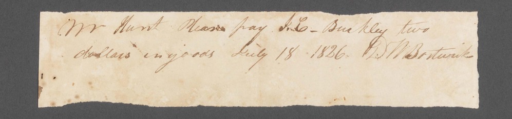 On front of document: "Mr Hunt Please pay I.C. Buckley two dollars in goods July 18 1826 DW Bostwick" On back of document: "DWB"