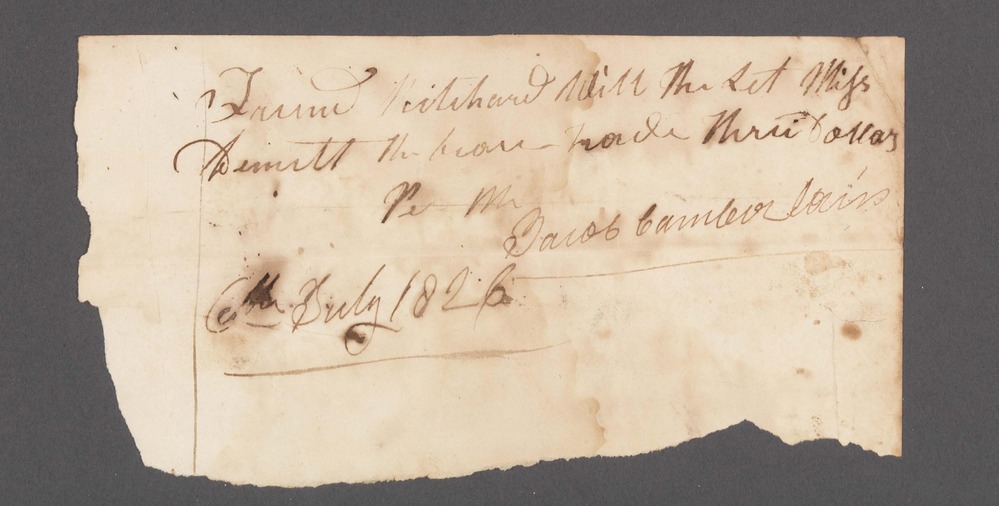 On front of document: "Friend Ritchard Will The Let [Miss?] Bennett the bearer have three dollars Per Me Jacob Chamberlain 6th July 1826" On back of document: "J. Chamberlain"