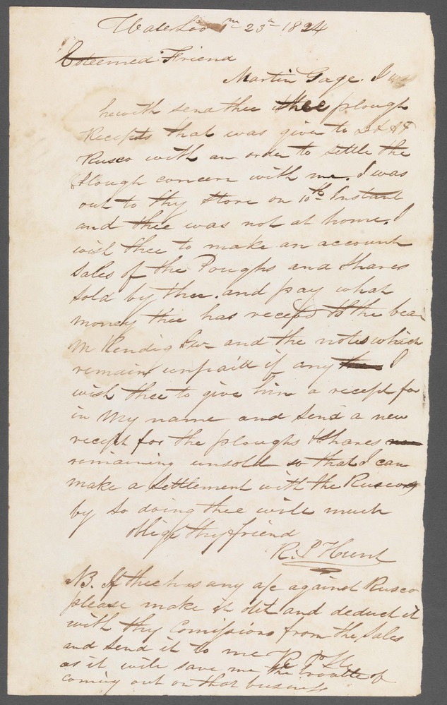 On front of document: “Waterloo 1m 23d 1824 Esteemed Friend Martin Gage, I herewith send thee the plough Recepts that was given to D & AP Rusco with an order to settle the Plough concern with me. I was out to thy store on 10th Instant and thee was not at home. I wish thee to make an account Sales of the P[l]oughs and Shares Sold by thee. and pay what money thee has recep’d to the bearer M Kendig Jr. and the notes which remain unpaid if any I wish thee to give him a recept for in My name and Send a new recept for the ploughs & Shares remaining unsold so that I can make a Settlement with the Ruscos by So doing thee will much oblige thy friend R.P. Hunt NB. If thee has any a/c against Rusco please make it out and deduct it with thy Comissions from the Sales and Send it to me RPH as it will save me the trouble of coming out on that business” On back of document: "Copy of a Letter to M Gage 1m-23rd-1824"