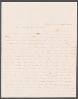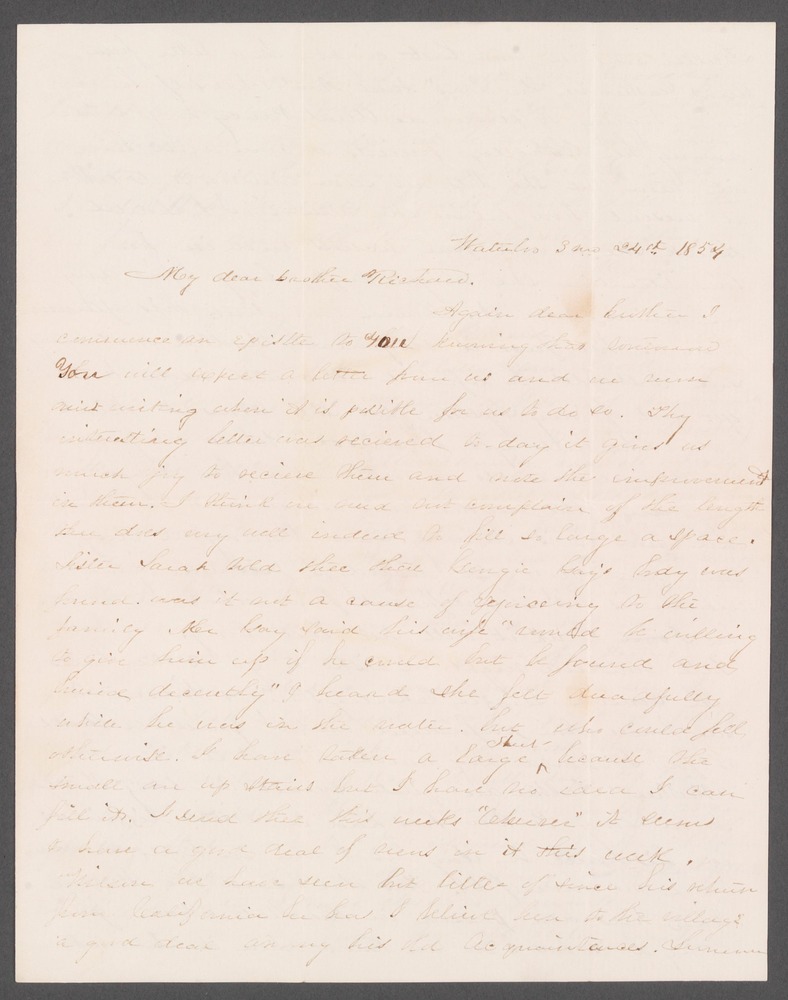 “Waterloo 3 mo 24th 1854 My dear brother Richard Again dear brother I commence an epistle to you knowing that [ ] You will expect a letter from us and we [ ] [ ]writing when it is possible for us to do so. Thy interesting letter was recieved to-day it gives us much joy to recieve them and note the improvement in them. I think we need but complain of the length thee does very well indeed to fill a large space. Sister Sarah told thee that Georgie Gay’s body was found was it not a cause of rejoicing to the family. Mr Gay said his wife ‘would be willing to give him up if he could but be found and buried decently.’ I heard she felt dreadfully while he was in the water but who could feel otherwise. I have rather a large sheet because the small are upstairs but I have no idea I can fill it. I send thee this weeks ‘Observer’ it seems to have a good deal of news in it this week. Wilson we have seen but little of since his return from California he has I believe been to the village a good deal among his old acquaintances. Sumner Fuller was in town last night. In a letter from Aunt Catharine she say ‘Aunt [Ann] and herself have been trying to persuade Aunt Nancy to go either among her orthodox friends or come and live with them but she does not seem willing to do either at present how [ ] she must live I should think she would fear [ ] and in her low situation she might suffer long before any one would know it. Maria was down this afternoon to see us her face is very much swollen and very [ ] I should be afraid it would never be got out of my system but she seems to think that she will yet be cured. What singular weather we have do we not but a few days ago and the weather was warm and pleasant and now it is snowing and [blowing] all day long and very cold indeed I presume your weather is not very different from what we have but I think it will not last long. Well tomorrow night we wish to go to the Falls with cousins Lizzie Charley Julia and Wilson to see Uncle Tom performed and I guess we shall go for I would very much like to see it Mother & Father are quite smart to-day [ ] I am [sorry] Father has had a little dizziness in his head to-day but I am in hopes he may have no more of it. Has thee heard the Maine Law has been passed in this State what a good thing it is but I do not know when it will take effect but I beleive it had not yet been decided. I suppose you will miss cousin Lizzie and Adaline very much but they will not be away very long. Father prefers thee staying until session is out I enclosed $1 for the [??] I guess I must close with love from me and all thy affectionate sister Mary” “Dear Brother Richard As Mary has left a little space I will try to fill it as best I can. as I do not know much to say. Willie just says tell him we are thrashing with the oxen Brindle Skunky and all. sixty Bushels were what was thrashed yesterday whereas three men could thrash only Twenty-four. perhaps we did not tell thee sometime ago Mary recieved a long letter from Marcella. I wrote to her but for some reason unknown to me she did not answer mine. she spoke of Having quite a time about a mouse found in one of the girls desk and passed round a good ways finally Rachel Jackson’s son took it and chased them around the room but enough of this. Fourth day at two oclock I attended the sermons (some parts) was very affecting that which he addressed to the children he also spoke of some of us being George Gay’s school fellows as it is late I must close so farewell from thy affectionate sister Sarah”