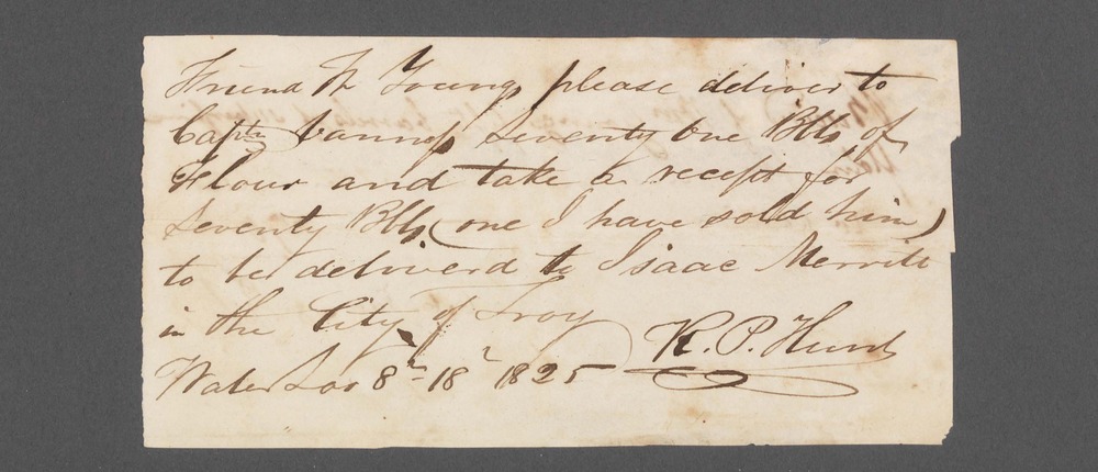On front of document: “Friend W Youngs please deliver to Capt Vanness Seventy One Bbls of Flour and take a recept for Seventy Bbls (one I have sold him) to be delivered to Isaac Merritt in the City of Troy R.P. Hunt Waterloo 8mo 18d 1825” On back of document: “Receiv'd of Wm Young fifty barrels of superfine flour for [illegible] on the [within?] also 20 bbls do 70 C.C. Van Ness"