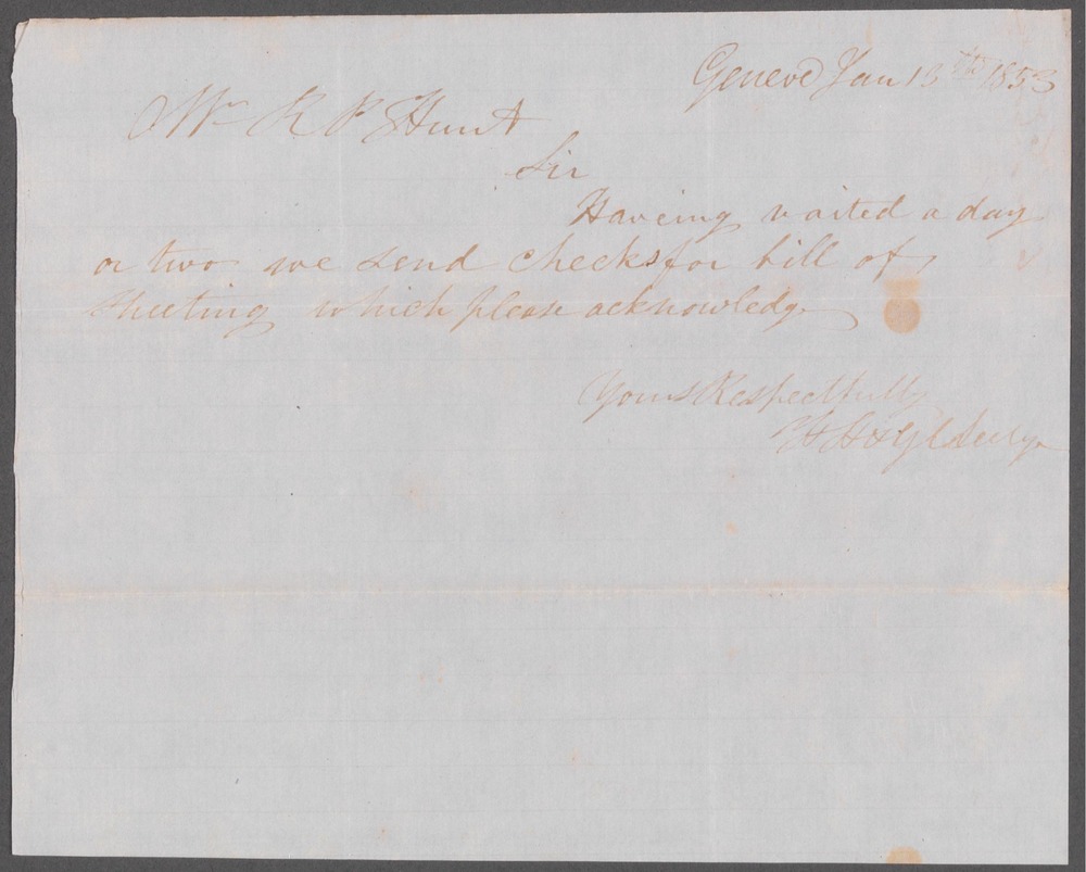 On front of document: “Geneva Jan 13th 1853 Mr R P Hunt Sir Having waited a day or two we send checks for bill of 1 sheetings which please acknowledge Yours Respectfully H H & G L Seelye” On back of document: "H.H. & G. L. Seelye 1mo 13th 53"