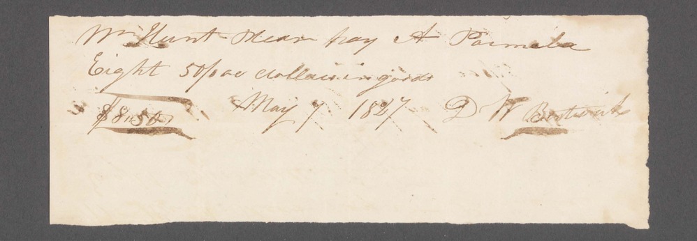 On front of document: "Mr Hunt Please pay A [Parmala?] Eight 50/100 dollars in goods $8.50 May 7 1827 D W Bostwick" On back of document: "DWB 5mo 7th 1827"